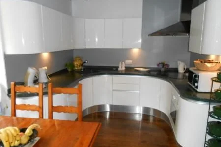 State of the art Pedini fitted dining kitchen (12ft x 17 ft / 4m x 5m) with curved induction hob and curved corian work surfaces.