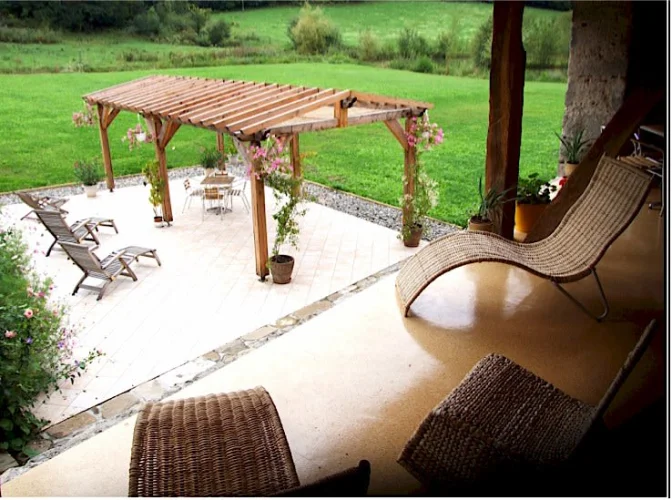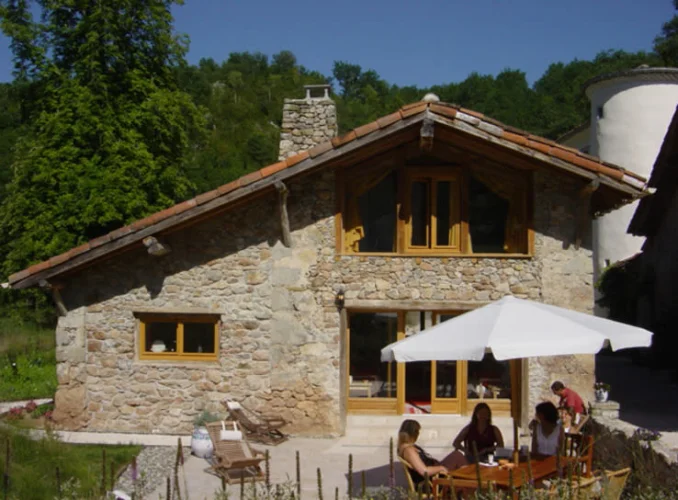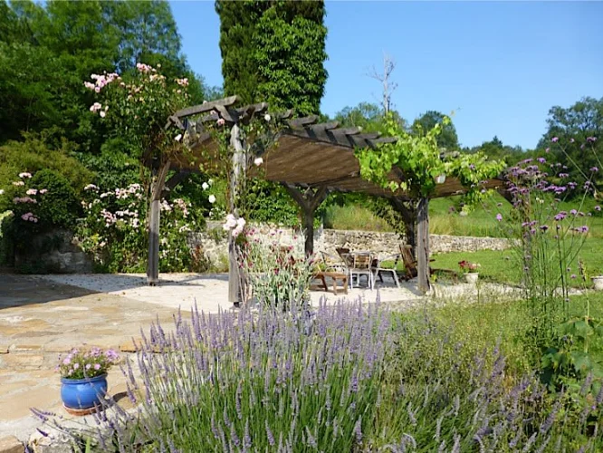 La Grange : une grande grange en pierre avec 7 chambres en suite, 2 cuisines, salon, balcon pleine longueur, terrasse et pergola.