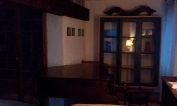 Salon avec trois fenêtres, carrelage en marbre, doubles portes vitrées de chaque côté (donnant sur la rue et l'escalier), vitrine murale. Grand poêle à bois vitré avec conduit de cheminée, chauffant l'escalier et les étages supérieurs. Chauffage électrique avec thermostat dans toutes les pièces.