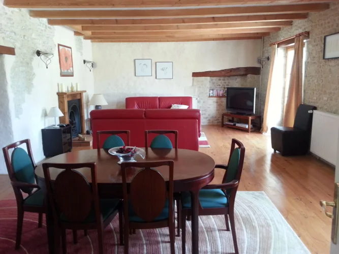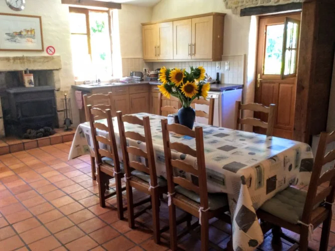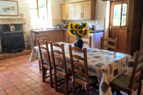 La Grange was the original farmhouse and the spacious kitchen / dining area has recently been upgraded with new worktops, tiling and appliances including a large fridge freezer, dishwasher, washing machine, gas hob and electric oven. It also contains a very large dining table with padded bench seating and 2 single lounge chairs.