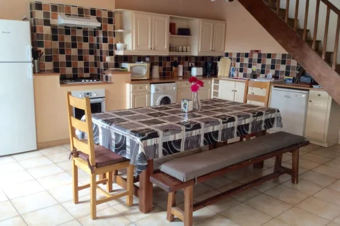 Being the original hayloft, the large and character-full open plan kitchen, lounge and dining room is accessed by a separate external staircase. The kitchen is fully equipped and there is an extendible dining table and chairs as well as a large lounge which converts to a large comfortable double sofa bed. There is a wood burning stove as well as attractive original wooden beams and English satellite television.