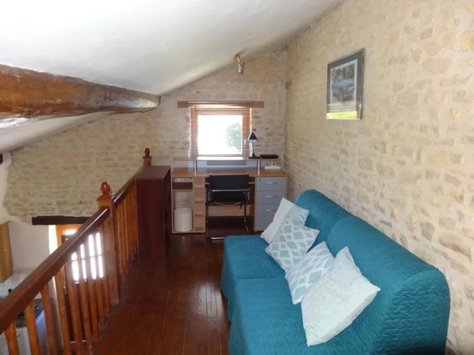 The wooden stairway leading up from the kitchen/ dining area gives access to a spacious mezzanine floor which can be used either as office, reading area or the 2 sofa beds can be, if required, converted to sleep older children.