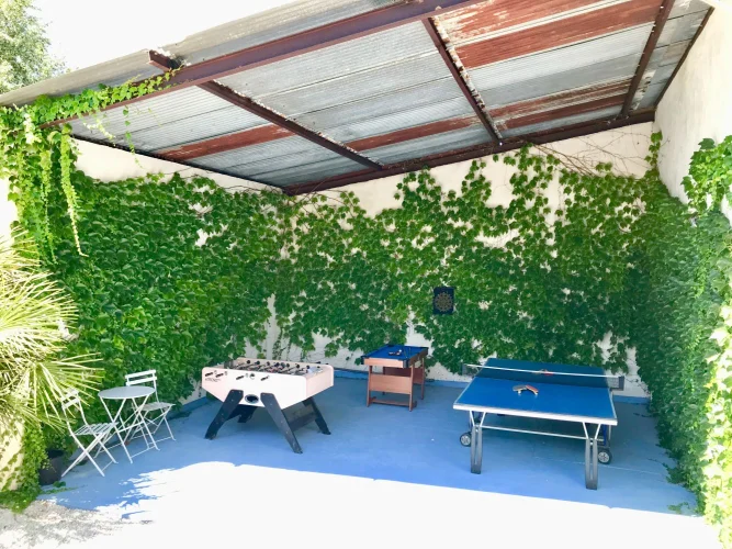 Providing useful shade and shelter this covered play area, which has its own lighting, contains table tennis, table football and magnetic darts as well as some bicycles for guest use.