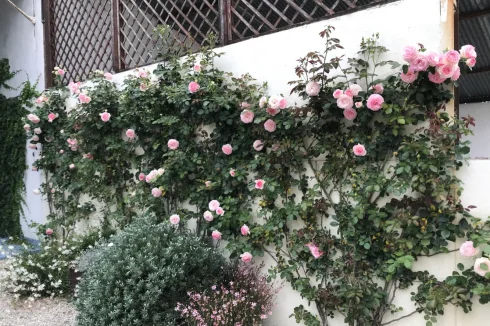 Separated by the central staircase, the character living room on one side is equipped with English satellite television and 3 comfortable lounge chairs. On the other side is a fully equipped kitchen/ dining area with large fridge freezer, gas cooker, washing machine and dishwasher. They both open onto a private courtyard which is festooned with flowers and comes with a table, chairs market umbrella and a charcoal BBQ.
