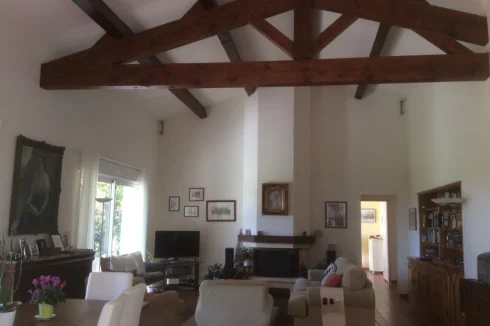 A large 50 m2 living room with a wooden beam cathedral ceiling and fireplace looking onto a covered 32 m2 south facing terrace.