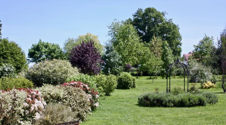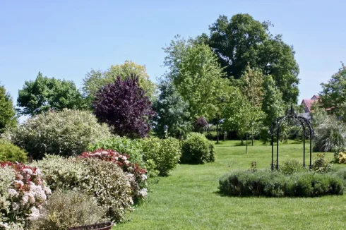 The 2-hectare plot consists of a pasture (1 ha) and a beautifully landscaped garden with trees.