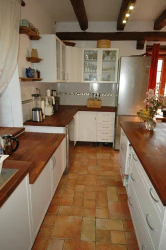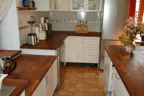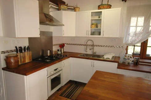 . 1 brand new and fully equipped open floor plan kitchen with solid teak wood counter tops, stainless steel hood with external ventilation, double cooking table (propane + electric), large stainless steel sink, a central island, 16 electrical outlets, and lots of storage.