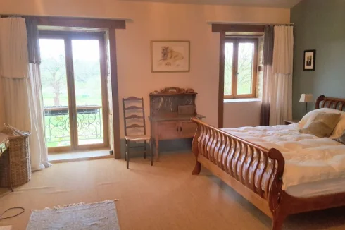 Stunning architect designed country house and successful gite complex for sale. The main house was fully renovated eight years ago, so the roof, electrics, plumbing etc are all as new. Although the external appearance is traditional, the interior is bright and modern. The lounge and huge terrace face SW and there is a stunning double height entrance hall with oak and glass staircase. Upstairs there are three large bedrooms and two bathrooms. It has lots of insulation, geothermal heating and a large wood burner. It's economical to run and you will never be cold in this house! The main house features a large garden with trees, flowers, vegetable garden and beautiful views.