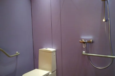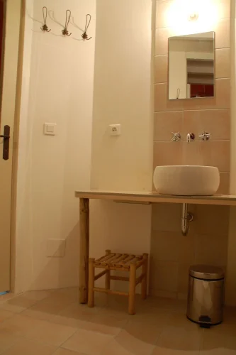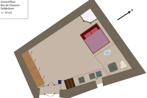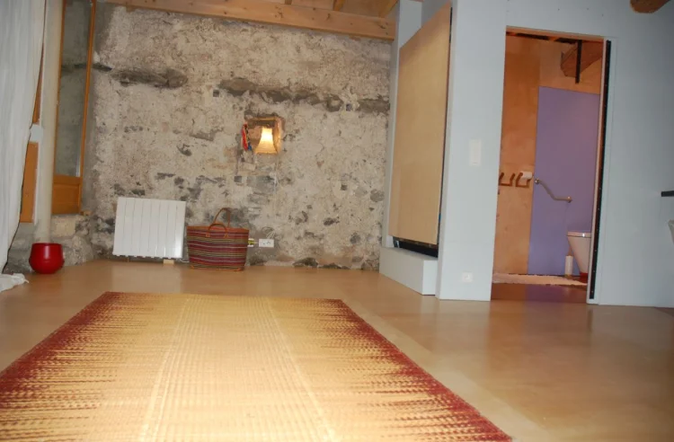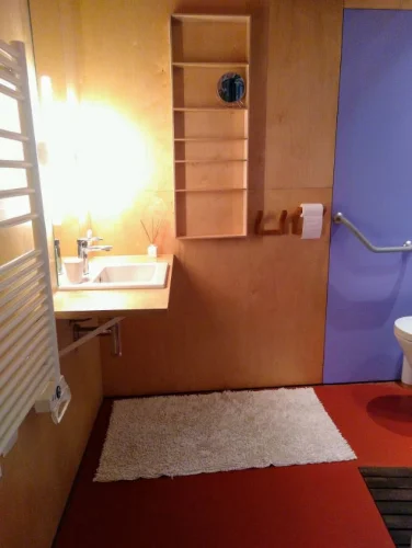 The ground floor (+/-55 m²) is suitable for teaching courses, to develop a therapeutic practice...and importantly accessible to wheelchair users, persons with disabilities. Includes low fold-out double bed, step-free access, fixed grab bars for shower and toilet, shower chair, roll-in shower, accessible height toilet. Wide doorways. If needed, can also be used as a garage.