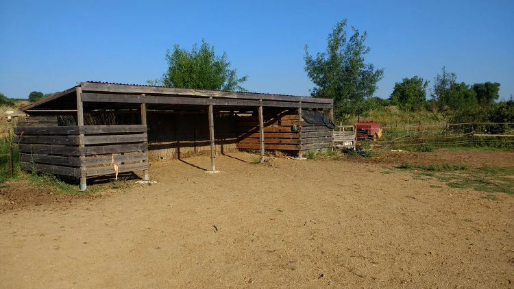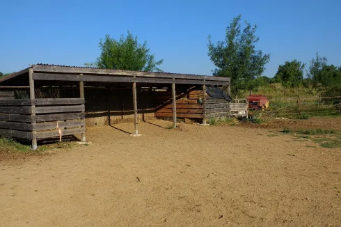 Pastures fenced // Wooded area for shade // Round pen of approximately 12 m diameter for training // Storage space for 200 hay bales. // Adjacent shelter for shade for animals (8 by 3 m) when too much sunshine // other small building (2 to 3 m)
