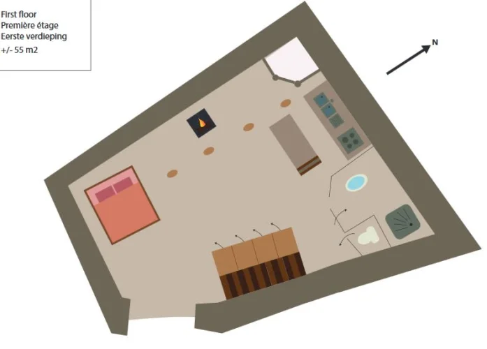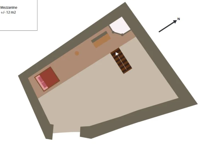 The first floor is an open floor loft with mezzanine (+/-70 m²) with high ceiling, a handy kitchen, bathroom and balcony with nice view. Possibility to install a roof terrace.