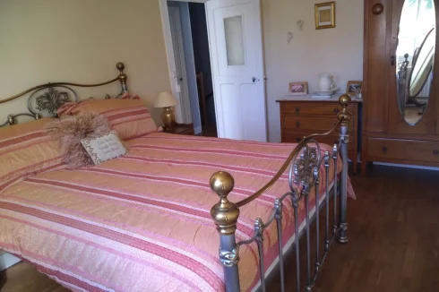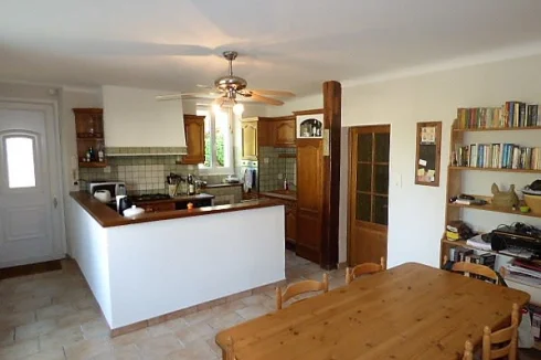 The door from the garden leads into the spacious family sized dining kitchen. Fitted wall and base units with ceramic tiled counters and oak French style bar above the counters. Housing for fridge/freezer, integral dishwasher, electric oven, and hob (3 gas rings, one electric plate) with extractor fan above. The hob is connected to a gas bottle concealed in one of the base units. Feature lights above the hob and sink. Window overlooking the garden, triple window to the side aspect. Ample electrical sockets. Two radiators. Intercom phone to buzzer outside the main gate. Switch for outside light. Overhead light fitting with fan. Ceramic tiled floor. Doorway and large window height aperture, with oak mantle, gives access to: