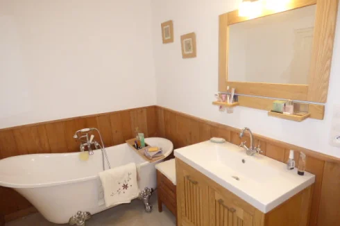 The large family bathroom has a Victorian style bath and fittings, and separate quadrant shower cabin. Cherry wood surround panelling, artisan crafted. Washbasin unit with mirror and lights over. Remote controlled brightness to overhead light. Remote controlled colour options spotlight above shower. Hairdryer/shaver socket. Extractor switch. Radiator. Ceramic tiled floor.