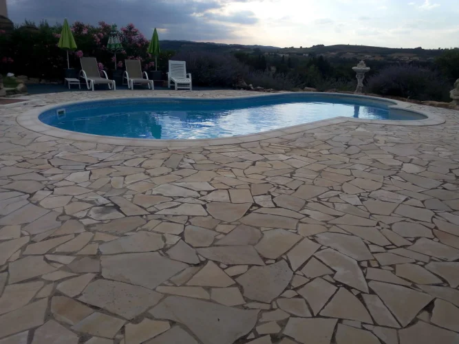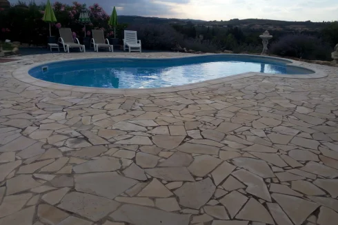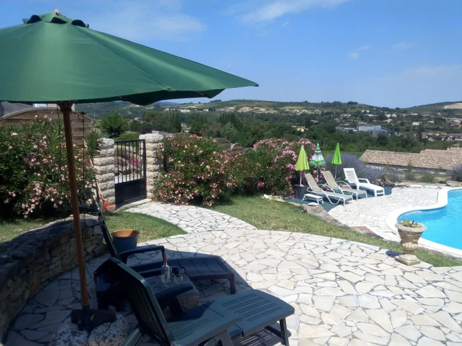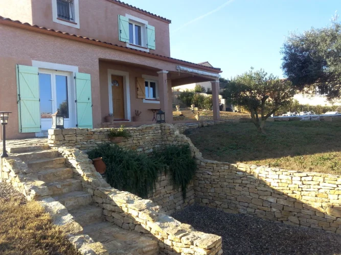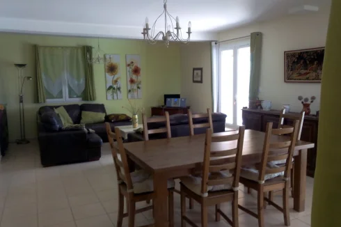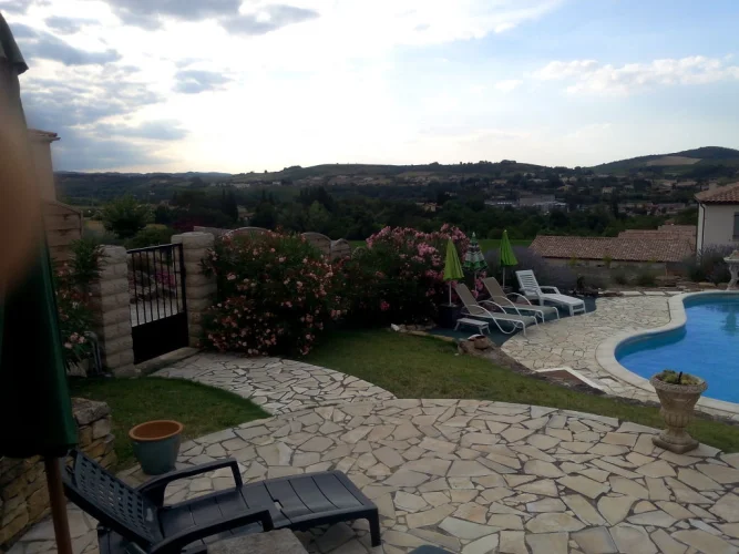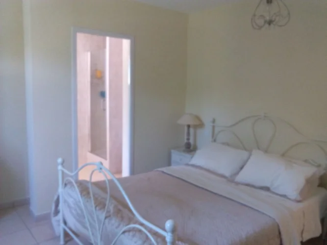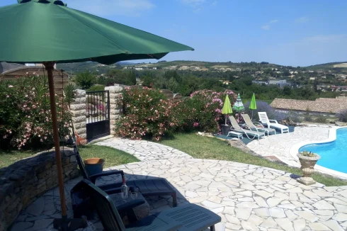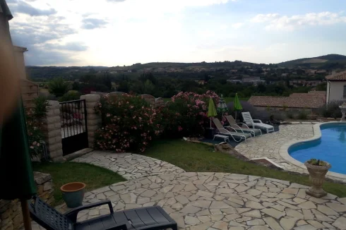 This large, comfortable, modern villa. Its elevated position overlooks the surrounding countryside that includes a picturesque castle. There is ample outdoor space with pool and shady terraces. On the ground floor there is a large living / dining room and an open plan kitchen with built-in cupboards, oven, and dishwasher. On the ground floor is the first bedroom with ensuite shower room and dressing room with built-in wardrobes. On the first floor there are three light filled comfortable bedrooms (10, 11, 13m2). One with ensuite shower room. There is also a separate bathroom. On the lower ground floor is a utility room with plumbing for washing machine etc.