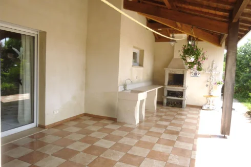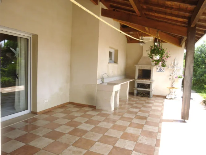 Huge covered terrace (140m²) with built in bbq & chimney. Ample space to install a large swimming pool. 2 car garage & workspace (floorplans online). Lush 3500m² garden surrounding the villa, with established mature trees & areas of shade.