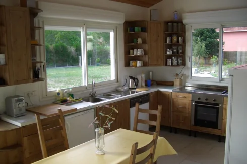 Inside the house, the modern kitchen has all-round views of the garden, double sink, electric hob and oven, double glazed with electric shutters and patio doors opening onto the veranda.