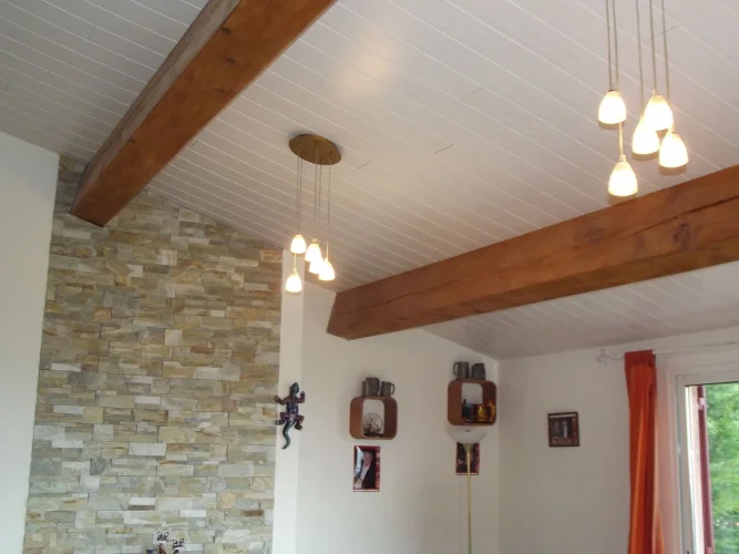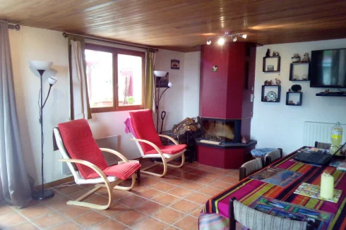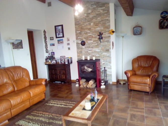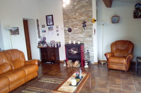 From the covered patio you enter the fully fitted kitchen with loads of cupboards and worktop space. THE dining area has room for a large table ideal for entertaining. The log burner is great for cosy winter evenings. From there you access the 28 sq.m lounge with sloping ceiling and wood beams, 2 double patio doors inviting the outside in and log burner. There is a large hallway with toilet and utility room with the central heating boiler. A door leads to the rear green.