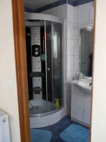 Bedroom 1 is 18sq.m with 2 windows looking east and north, fitted wardrobes and overhead cupboards unit with a tiled shower room with jet shower.