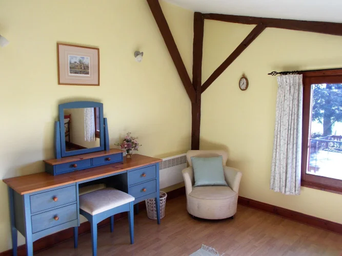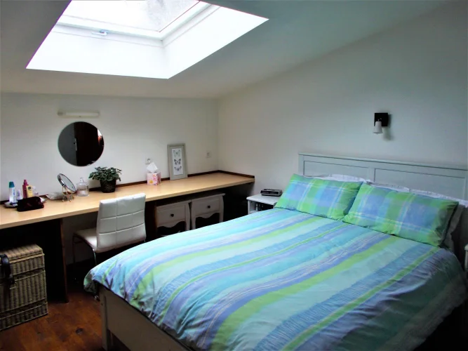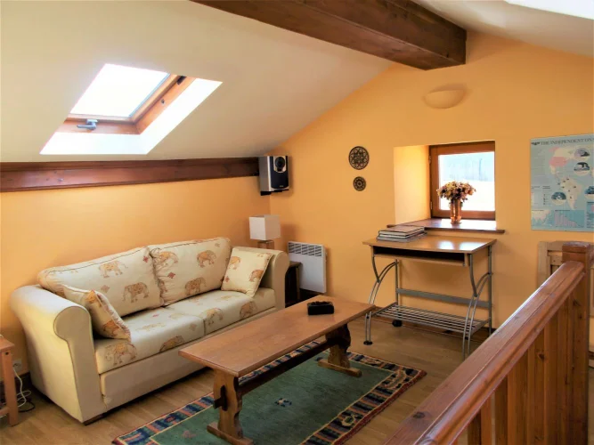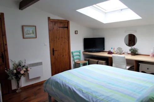 The barn conversion features a double-height sitting room (34m2) with inset wood-burner, and an open-plan, fully fitted kitchen (27.5m2) that comprises a washing machine, American-style fridge/freezer, electric oven and gas hob. A bedroom (13.5m2) and shower room (7.5m2) with double-width shower cubicle, wc and wash-hand basin completes the ground floor accommodation.