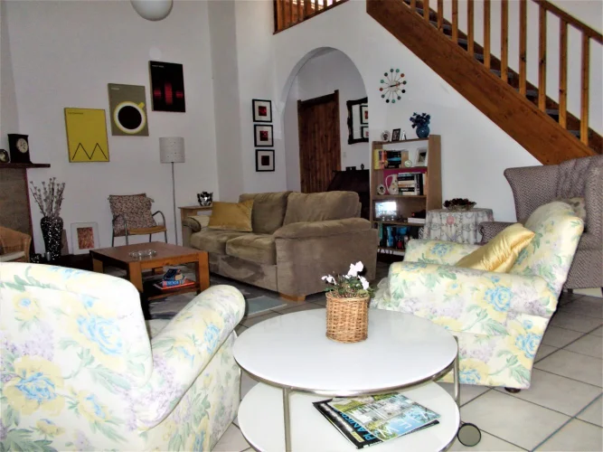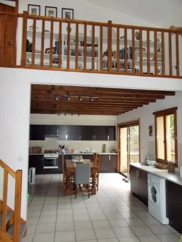 The farmhouse comprises a magnificent open plan lounge (55m2) with original oak beams, a Charentaise fireplace, and wood-burning stove. The fully fitted kitchen (18m2) incorporates a dishwasher, fridge, electric oven and ceramic hob, and the adjoining utility room (8m2) houses a washing machine, tumble dryer and fridge/freezer. A shower room (2m2) with shower cubicle, wc and wash-hand basin completes the ground floor accommodation.