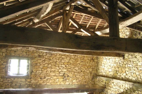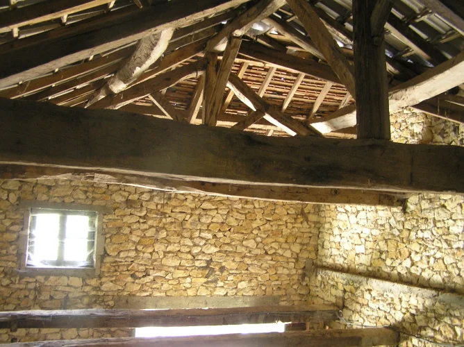 The house has a shared wall with the mill barn, its old grinding wheel and oil press. The little stream flows quietly two meters below. Surface: 70m² each floor. The double garage is distinct. So are the three sheds (channel tile and stone).