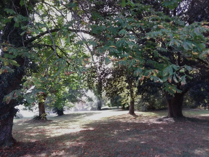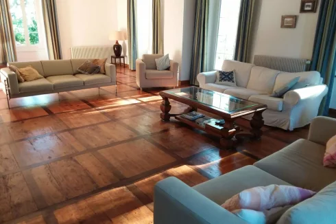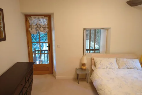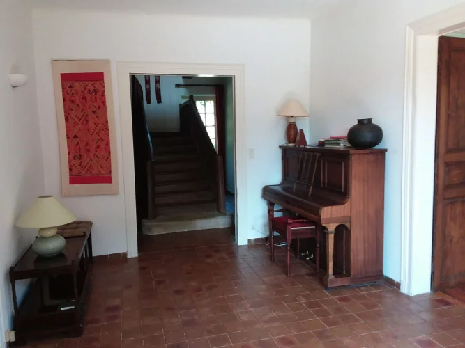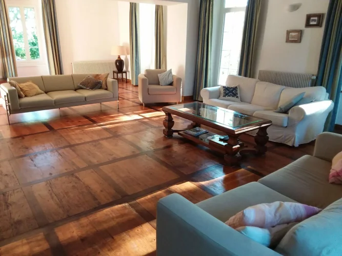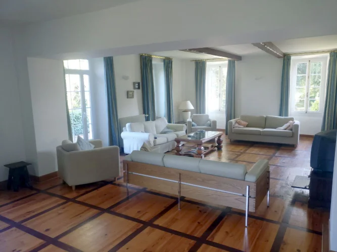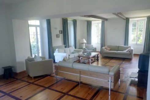 Large elegant salon 50m2 with wood floors. Triple facade with large windows and door to attractive terrace overlooking garden, pond and surrounding fields.