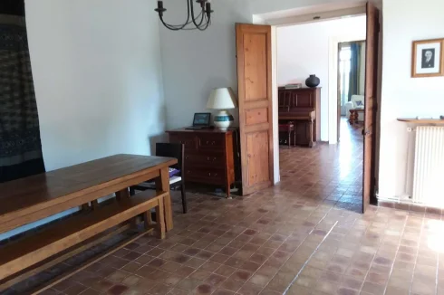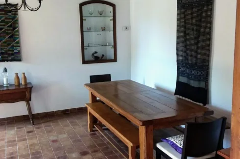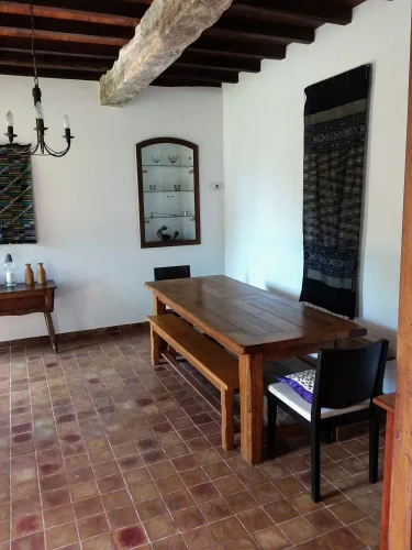 Dining room 22m2 with tiled floors, exposed beams and twin windows.