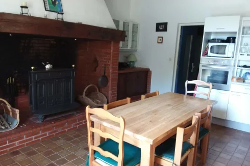 Kitchen 23m2 with white fitted units, tiled floors, exposed beams and brick-fronted fireplace with wood-burning stove.