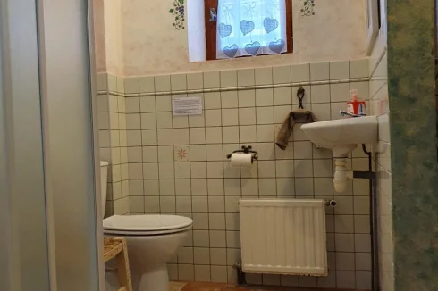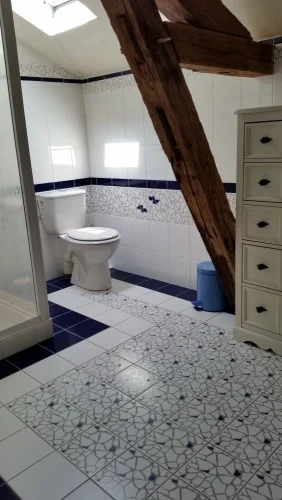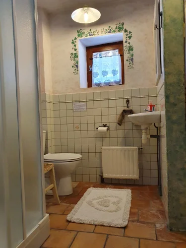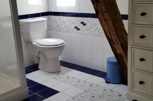 - Shower room (5.68 m2) W.C. basin and shower with Villeroy & Bosch tiles, tiled floor, exposed beams.