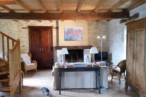 - Open Plan Living/Dining Space (44.12 m2) dual aspect, exposed beam ceiling, terracotta tiled floor, large open working fireplace.