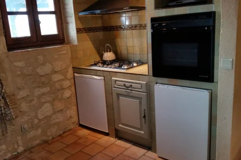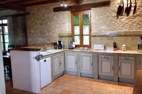 - Kitchen (20.79 m2) dual aspect, large open fireplace, exposed beam ceiling, terracotta tiled floor, fully fitted with dishwasher, new large gas hob, extract and new built-in electric oven.