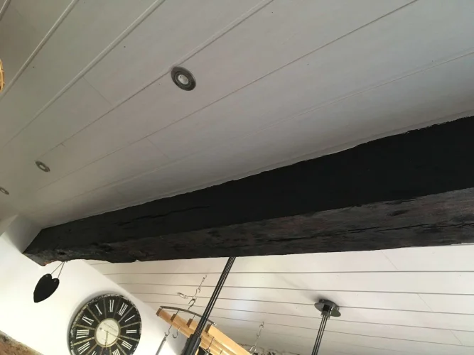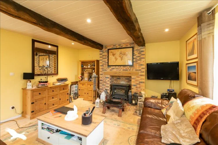 Dual aspect living room with stunning fireplace, woodburner, and large original beams