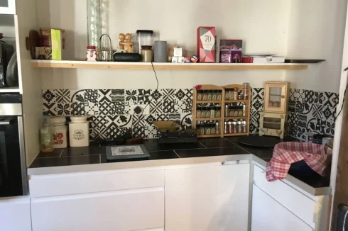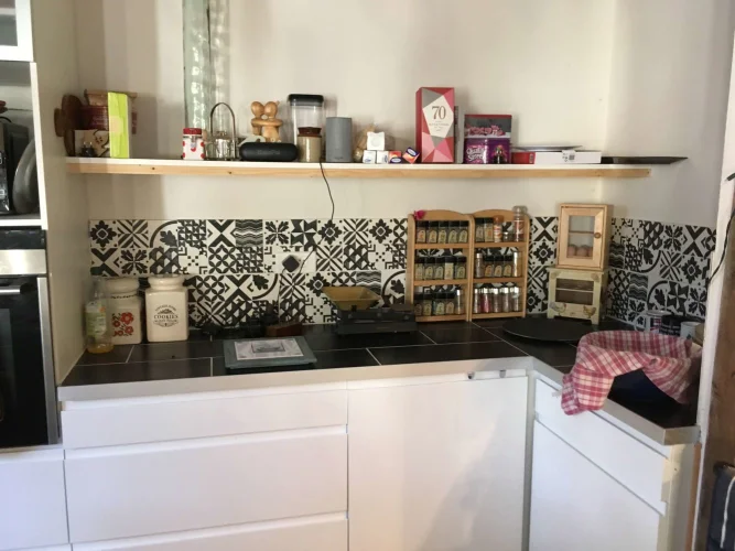 Beautiful tiles add fun to the kitchen, with plenty of fitted units for storage