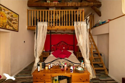 Master bedroom with French windows, en-suite, vaulted ceilings, original beams and private mezzanine