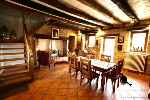 There is a formal hallway entrance in the middle of the long house, but both the dining room and the vast kitchen have direct access to the large front terraced area. The kitchen is fully fitted and equipped, with a dining-area and space for a large wood-burner. The main dining room sits in a central position with attractive wood-burning stove and offers exposed stone and beams. The grand salon is airy and light with enough room to receive an extended family or a large number of guests. There are 3 bedrooms, of which 2 are en-suite. The master bedroom has the luxury of both a bath and a shower. The guest houses are entirely separate from the main house, which is an ideal position for gîtes and are each offering lounge with kitchenette, shower room, WC, bedroom and terrace.