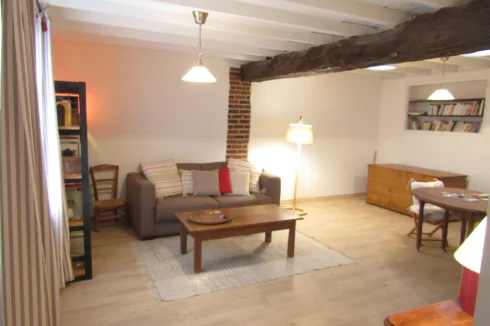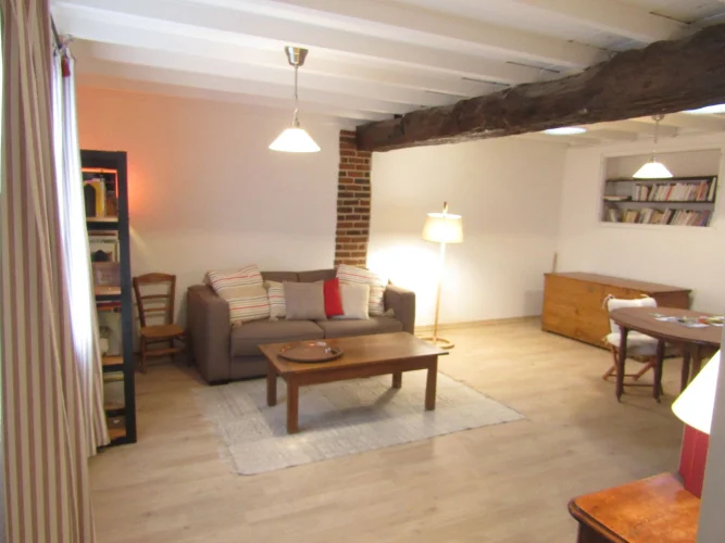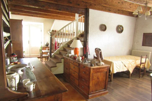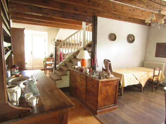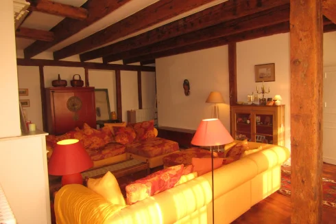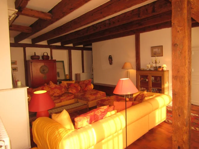 On the first floor, a large lounge of 50 m<sup>2</sup> is the <strong>master room with wooden beams on walls and the ceiling</strong>. There are also two bedrooms and a shower room, recently rebuilt.