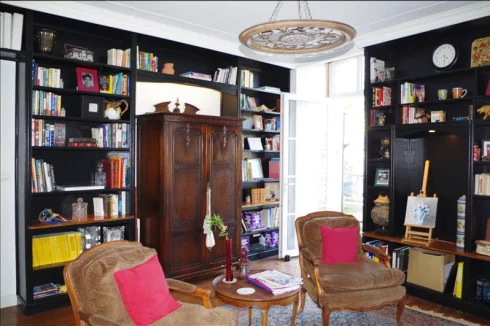 5 bedrooms, 3 bathrooms, 2 wc, including separate floors with a library (custom made integrated with home office), a sports gym, a raised very large terrace, full garage atelier, and enclosed garded with 3 parking spaces plus grassy area.