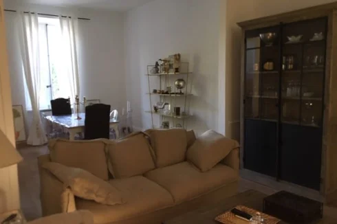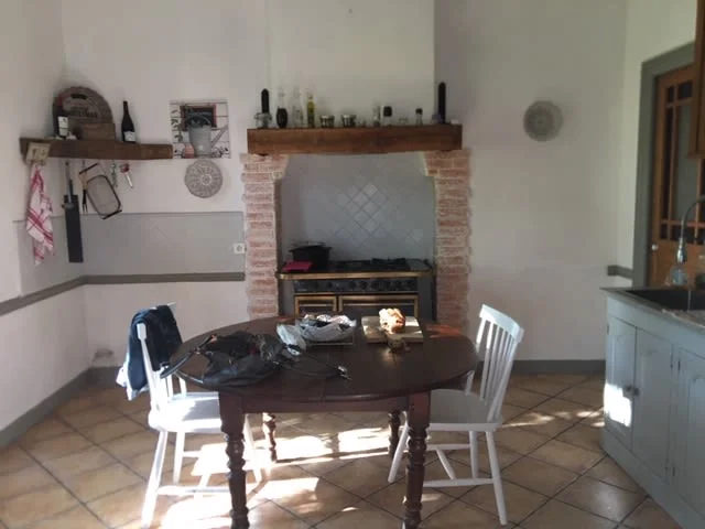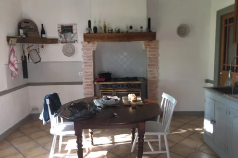 The adjoining main house, of 300m², has a small garden to the front, and the original wood door leads to an entrance hall: to the left, large kitchen (approx 16m²) to the right a living/dining room with original cornices and marble fireplace (45m²) there is also a utility room with original rustic fireplace for winter barbecues.