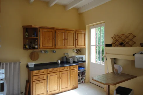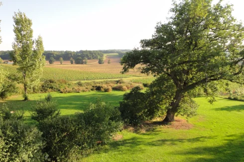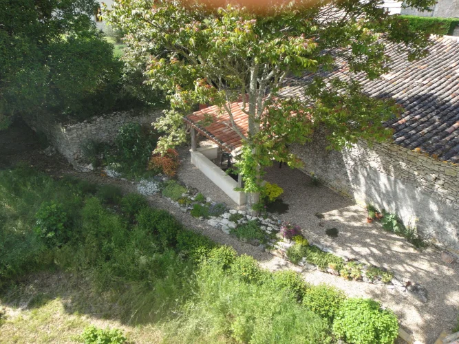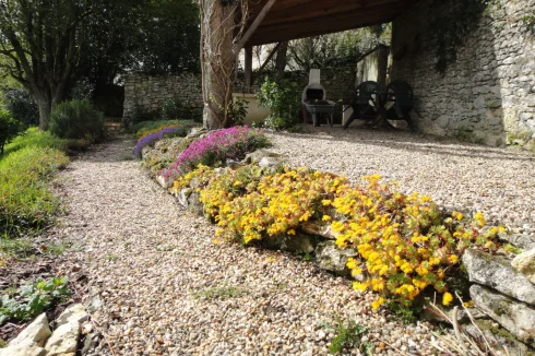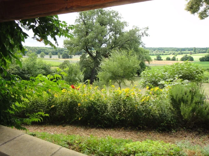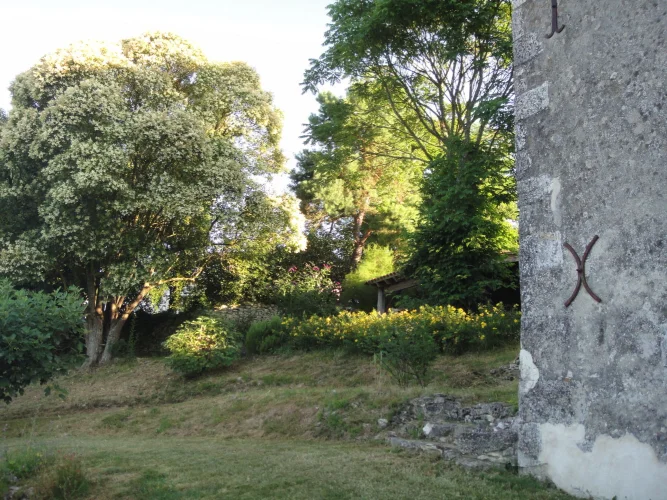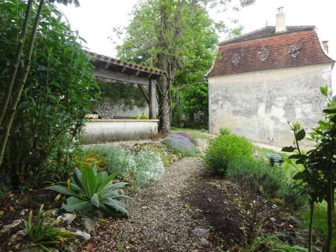The house has a very peaceful location and a unique view of the countryside. The garden is private and well-maintained. It is planted with fruit trees and leads directly into the vineyards beyond. There is a covered terrace for alfresco dining, and an open barn for undercover parking with stone out-buildings for wood storage etc. We have a log burner and oil central heating.