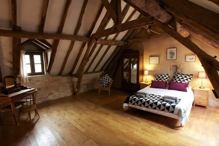 Chambre double 1 40m2 - avec plafond voûté et escalier menant au grenier.