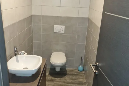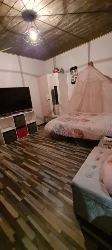 Salon,cuisine équipée 100m² pour le rez-de-chaussée de chaussée avec un toilettes au même niveau et garage de 90m² avec une porte automatique donnant sur une cours de 500m²