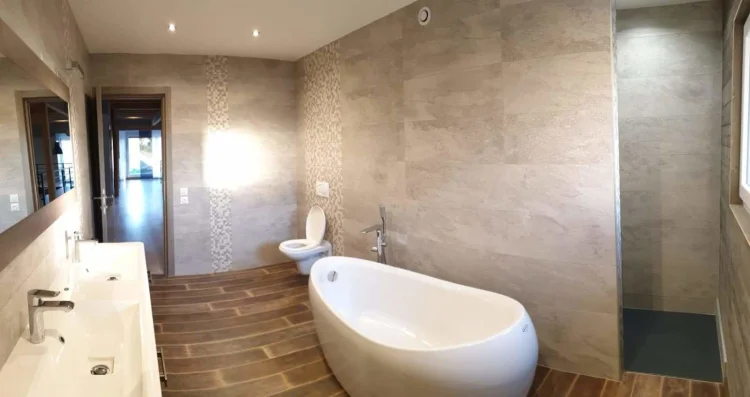 Une salle de bain centrale comprenant baignoire, douche italienne et toilettes, paroi chauffante des murs