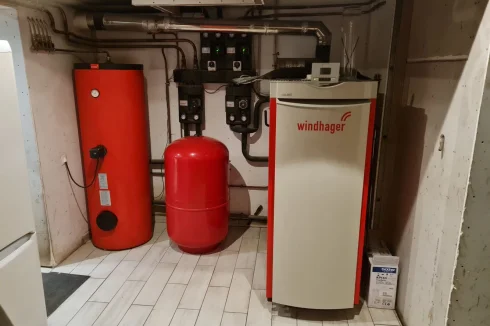Windhager wood fuel boiler with 2 buffer tanks of 1500l and a hot water tank of 300l.