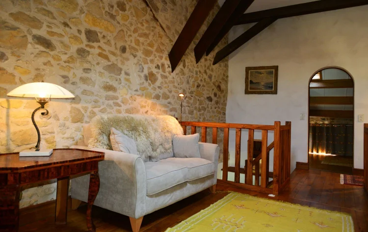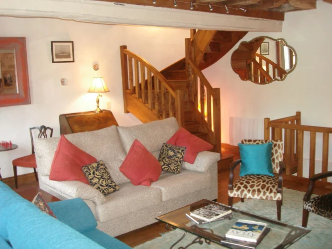A solid wooden oak staircase leads up from the kitchen/diner, to a large living room 42 m2 with high ceiling and mezzanine above. There are ample comfy sofas and chairs to accommodate 8 persons.