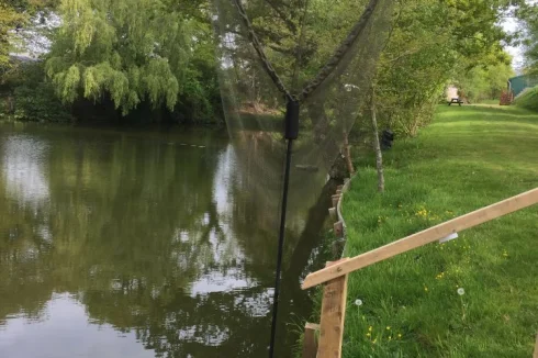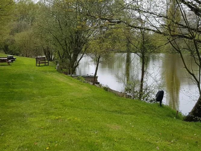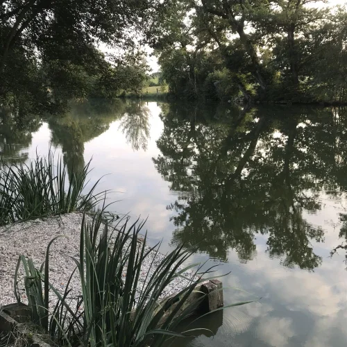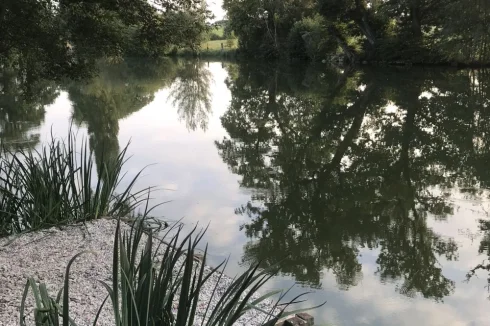 The main carp lake is approaching 2 acres with an average depth of 1½m and a deepest point of 4m. It has three solid block based swims, all having been recently constructed and with electric power points and wifi at each swim. It's a drainable, spring fed lake with a clay/silt base, lily pads and overhanging branches which are present on the near and far side margins. The lake is stocked with a good stock of carp up to 47 lb and was last netted in 2019. It has periodically been restocked with specimen fish, most recently in 2016.