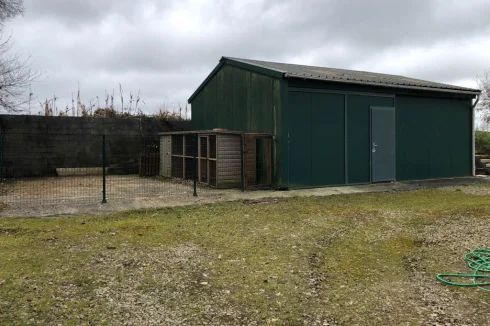 6.10m x 8.00m (20’x 26’3”) A large, high roofed garage/barn is located behind the house, with concrete floor and plastic coated metal sides and roof .This area provides electricity and racking, bait freezers and ample room for storing equipment (which will be sold with the property). There are other items within the garage which may be sold under separate negotiation. Two smaller sheds opposite the garage house the oil tank and are used for further storage. Next to the barn is a large concreted area with metal fencing and enclosed dog kennel/run