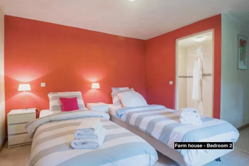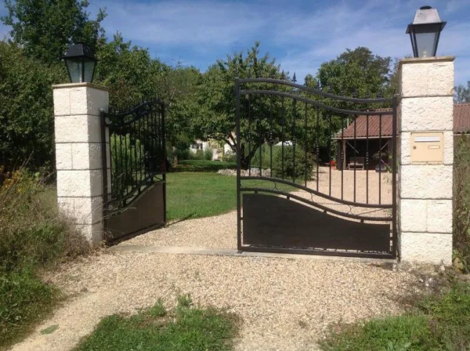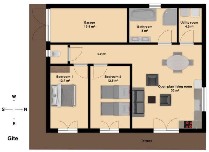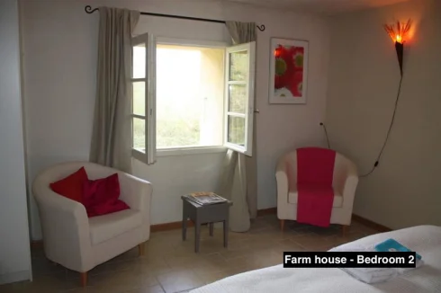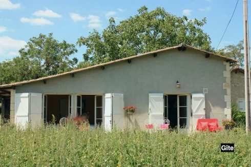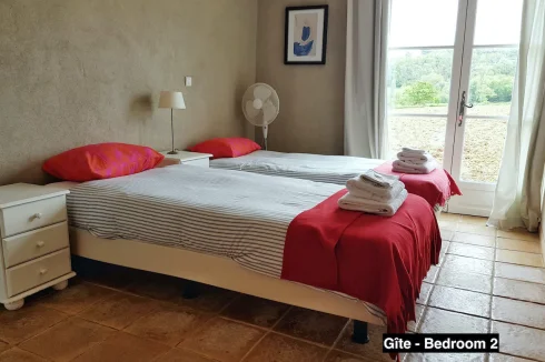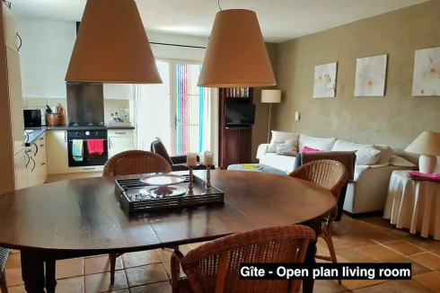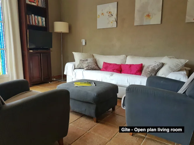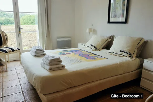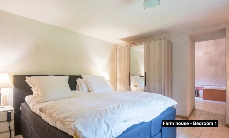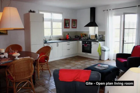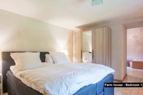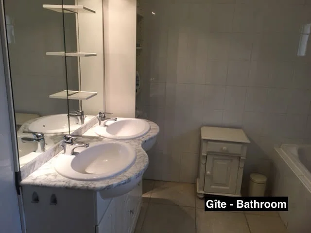 Next to the country house is a detached gîte (80 m2) with garage and a spacious open living room and kitchen. The kitchen is fully equipped with a gas hob, an oven, a dishwasher, and a microwave. In the gîte you will find 2 spacious double bedrooms with a separate WC in the hallway. The bathroom has a double sink, a bath and a separate spacious shower. The gîte is equipped with a central heating system which is situated in the utility room as well as plumbing connections for a washing machine and tumble dryer.