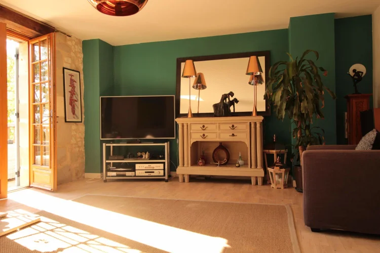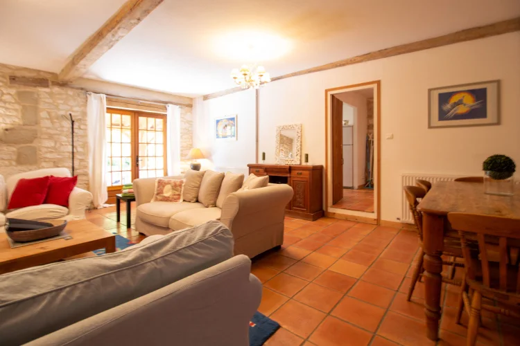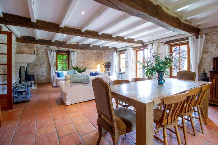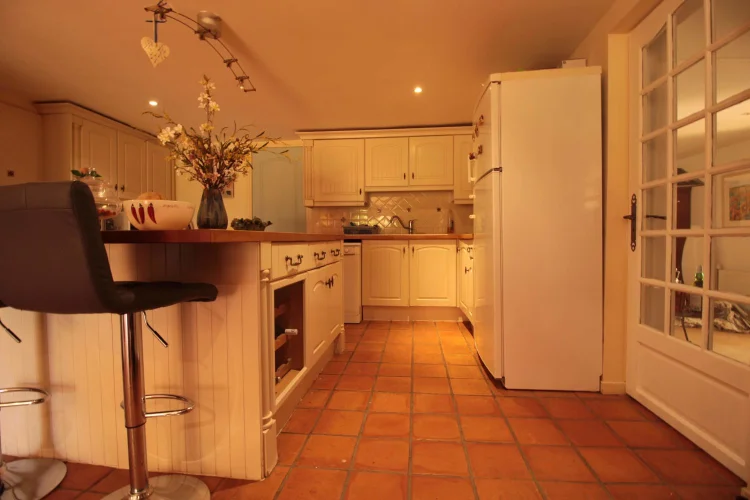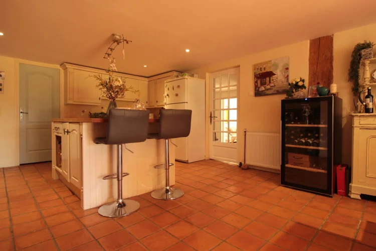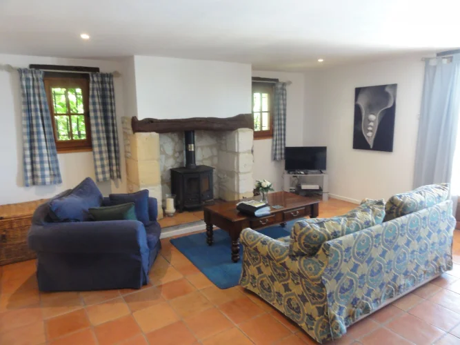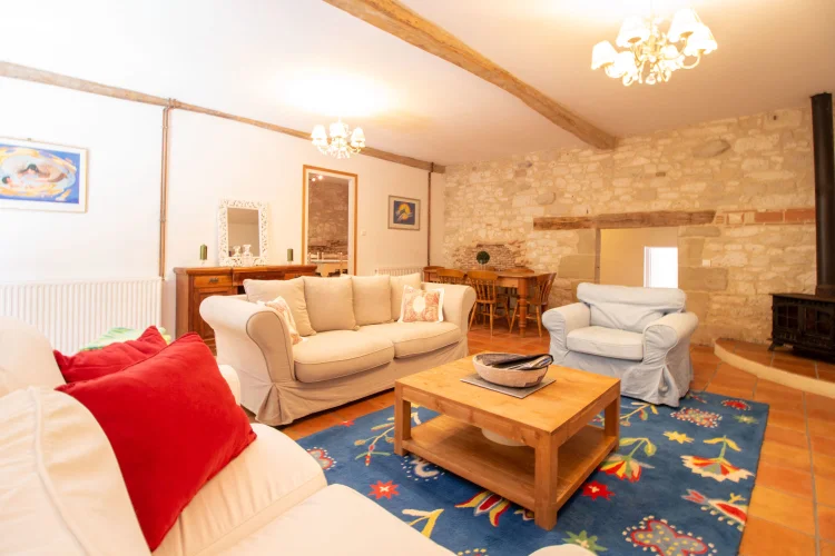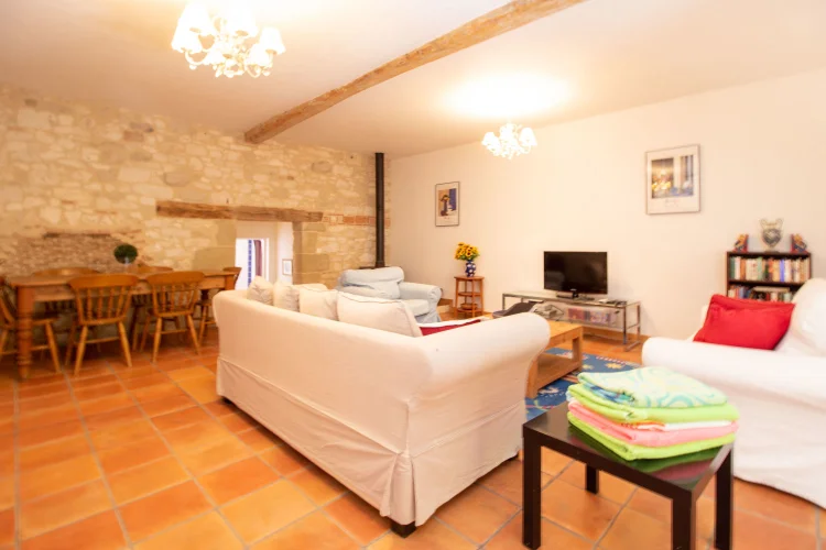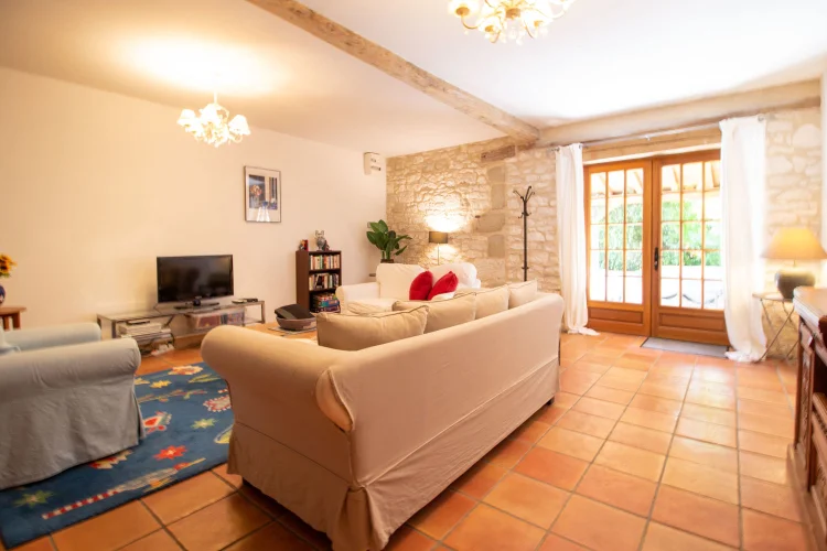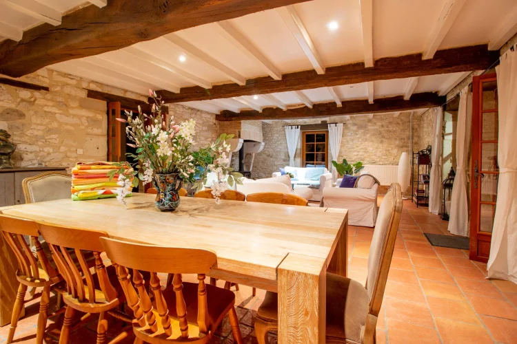 Le logement des propriétaires-la grange-comprend; un vaste porche avec porte d'entrée dans un hall à double hauteur, avec la 4ème chambre à gauche, et la buanderie et la chaufferie à droite. La grande cuisine-salle à manger entièrement équipée avec îlot a des portes-fenêtres ouvrant sur une terrasse couverte, avec une autre terrasse dans le jardin. Le sol est en tomettes décoratives haut de gamme. Off the Kitchen est un garde-manger / garde-manger. Au coeur de la maison se trouve un large hall avec des portes-fenêtres menant à une terrasse couverte donnant sur les jardins et la piscine, et à l'autre extrémité à un petit bureau. Les portes mènent à; salon avec sol en châtaignier, poêle à bois et portes-fenêtres menant à une grande terrasse ; salle de bain familiale; chambre principale avec salle de bains et portes-fenêtres donnant accès à la terrasse de la piscine ; chambre 2 avec salle de bains privative ; chambre 3. Le grand grenier pourrait être utilisé pour fournir un logement supplémentaire.