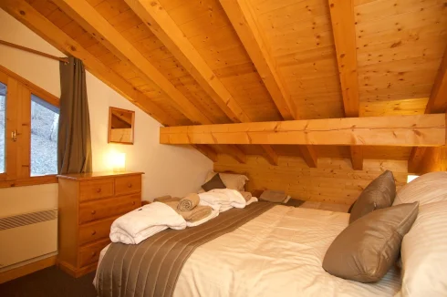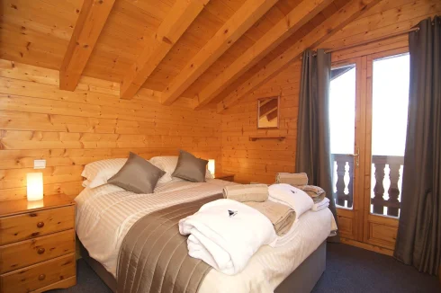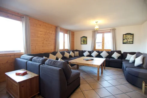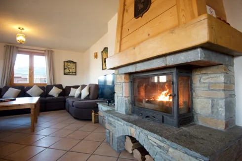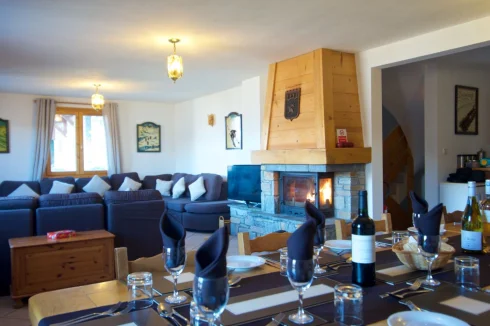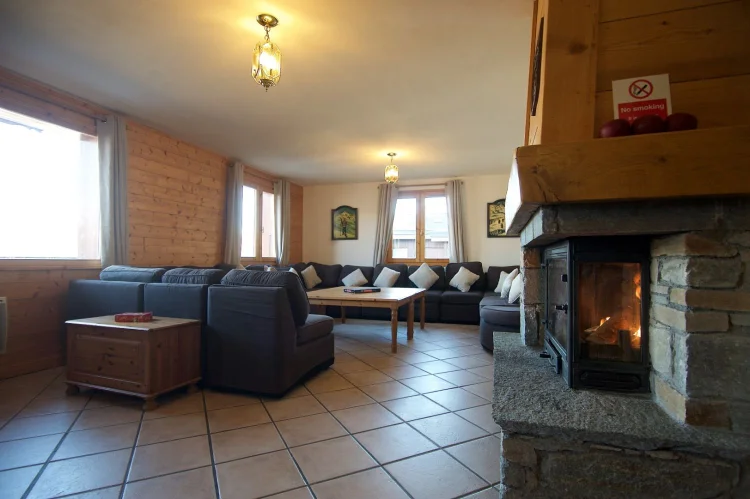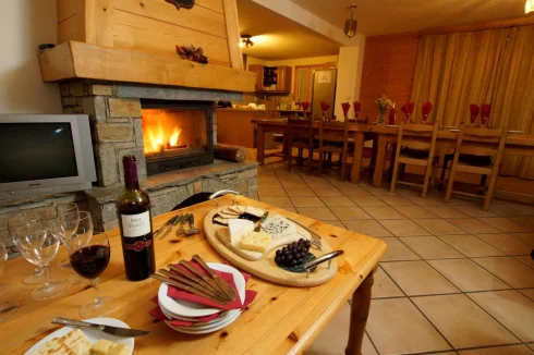 The open-plan living area has plenty of space for comfortable seating and dining for up to 18 people and benefits from a terrace at the rear of the property and a large wrap-around balcony at the front, with spectacular views towards Mont Blanc. The focus of the room is on the natural stone fireplace.
