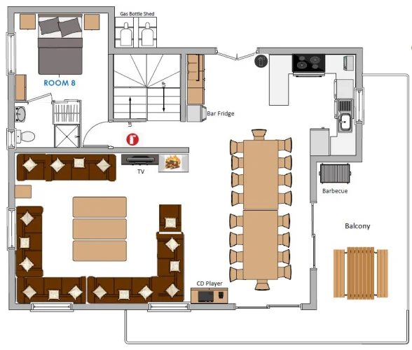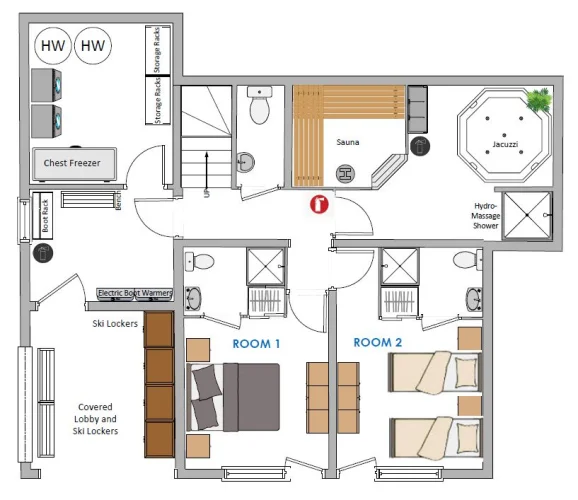 On the ground floor, you will find a luxury “playroom” with hexagonal sunken jacuzzi, large sauna and hydro-massage shower. There is also a store room/laundry, a good sized boot-room with electric boot warmers and outside ski lockers in the covered porch.